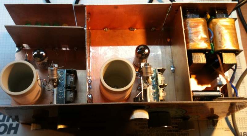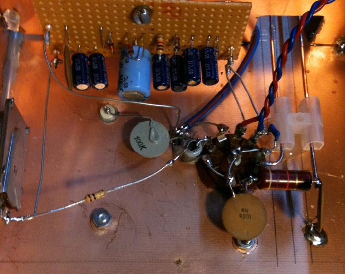 Die Vorstufe gesehen von der linken Seite in Richtung Audionstufe. Links am Rand der Regler für die Steilheit der EF183. Rechts am Rand die Drähte, die durch die leeren Lüsterklemmenhülsen geführt sind rechts die Anodenspannung und links der Anodenausgang der Vorstufenröhre. Die Platine peppt mit einer Delon-Schaltung mit nachfolgender Z-Dioden-Stabilisierung die 6,3V Heizspannung auf die 12V Regelspannung für die EF183 auf. (Die kleinen Kondensatoren sind immer 2x22µF parallel, weil ich davon Unmengen in der Bastelkiste hatte.)