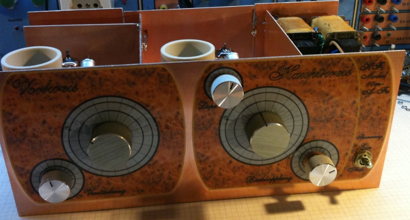 In den letzten Tagen habe ich versucht, den Empfänger neu aufzubauen. Soweit bin ich fertig, habe aber noch nichts getestet. Nach kurzem anschließen nur so viel: Irgendwo schwingt es und die Anodenspannung klettert noch auf ca. 270 Volt. Da muß ich noch etwas ändern. In den nächsten Tagen werde ich mich an die Optimierung der Bauteilwerte machen.