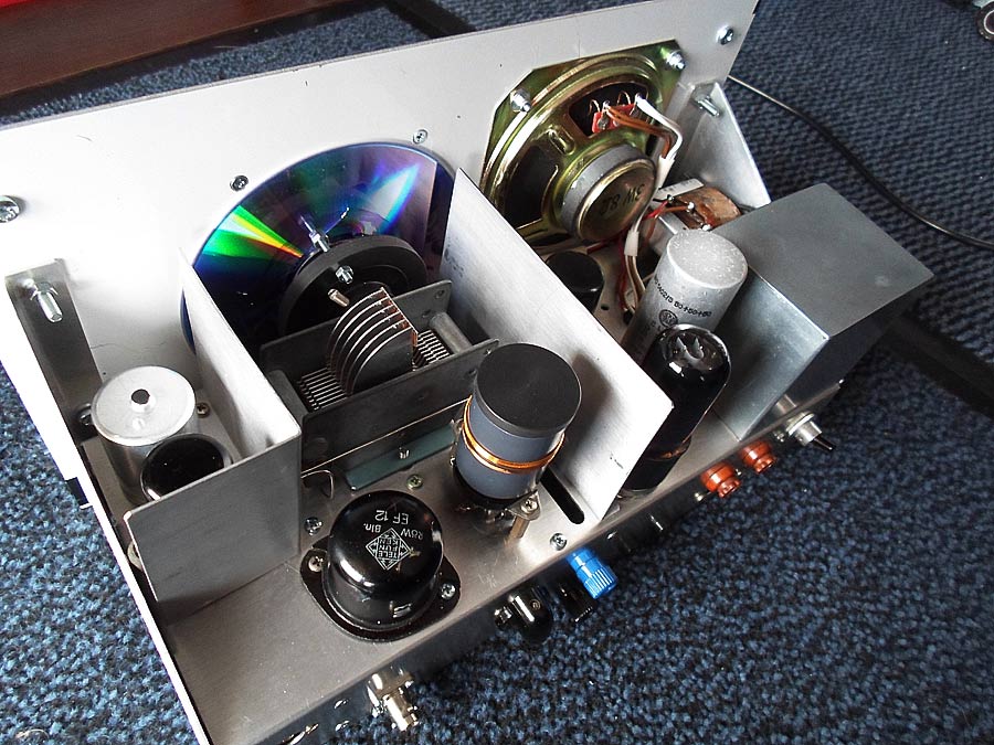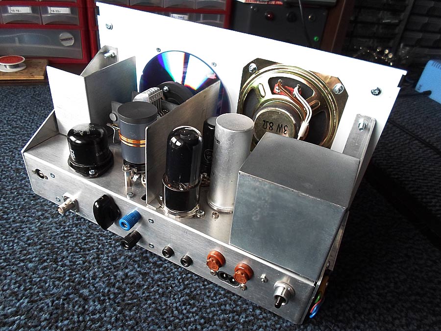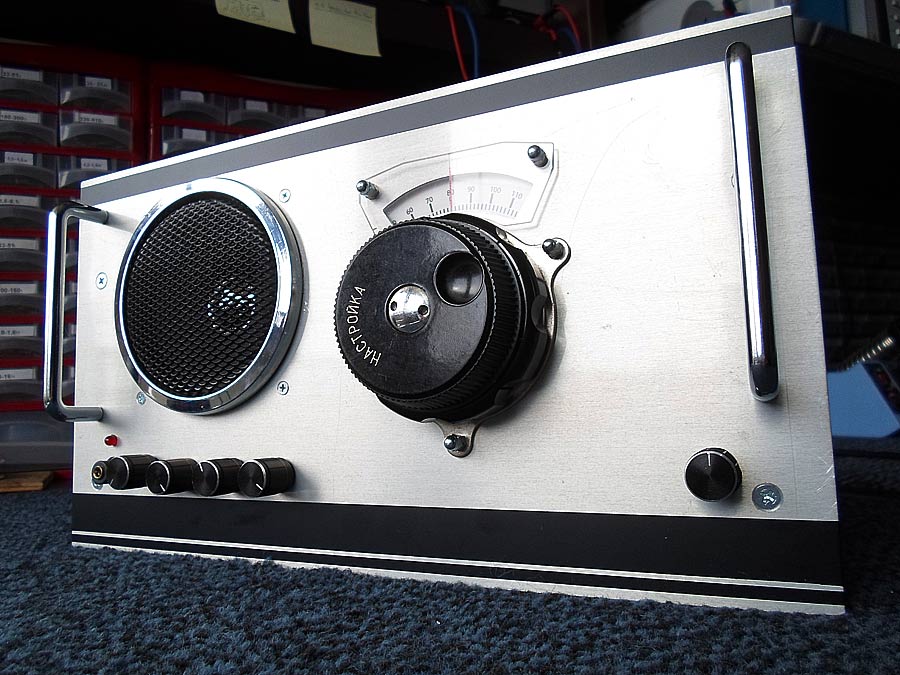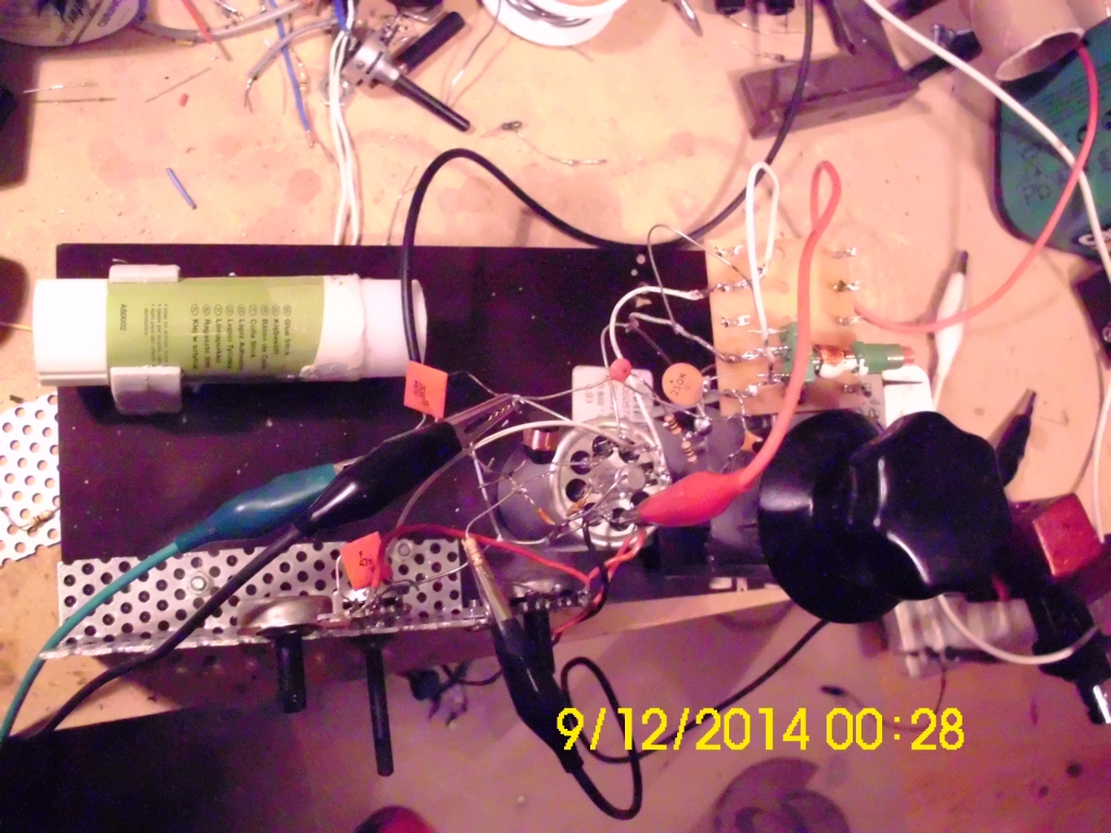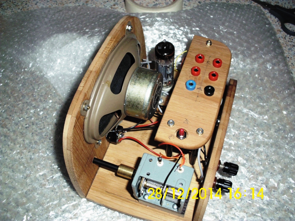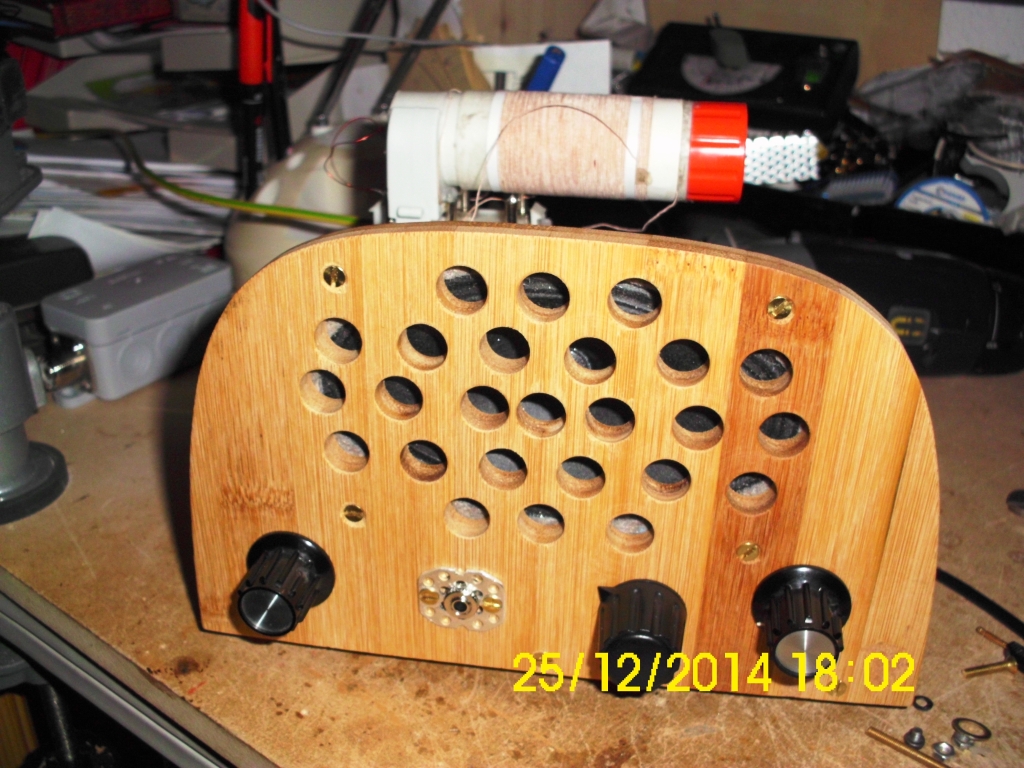 ich bin schon auch ein paar Schnittchen, mit meinem Projekt, nach Vorne gekommen. Ich wollte unbedingt das Radio noch bis zu Ende 2014 fertig kriegen, weil im Jahr 2014 war grade das Jubiläum. Genau vor 100 Jahre hat Armstrong das Prinzip von Rückkopplung in Empfänger entdeckt und erste Audion gebaut. Am 30 Dezember war ich auch fertig. Bei erstem Einschaltung hat das Radio schon funktioniert. Bei Audions (Regen) ist das üblich. Ich war glücklich. Aber das wird noch ein langer Weg bis das Radio wird so funktionieren, wie ich stelle mir das vor. So sieht das momentan aus: