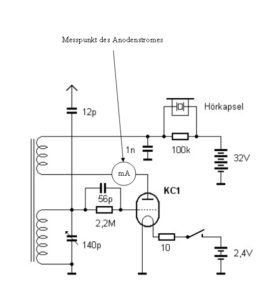 ja.. Dein Hinweis ist berechtigt. Ich wollte aber auch sicherstellen, dass es da nicht noch einen parallelen Stromkreis gibt. Die 10mA geben einem wirklich zu denken. Generell sollten keine fliegenden Aufbauten in den HF- Kreisen aufgebaut werden. Kurze Drahtverbindungen, gute Isolation usw. sind zu beachten. Ich habe einen Strom von gerade mal 85uA im Anodenkreis beim Empfang mit meiner Rahmenantenne. Ich benutze aber die Radiomann Schaltung. Manfreds- Schaltung und Röhre ist nur bedingt damit vergleichbar. Ich fahre morgen auf einen Kurzurlaub in den Harz, bin schon gespannt ob die Rückkopplung mit der KC1, zum Erfolg gebracht werden kann.