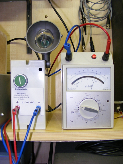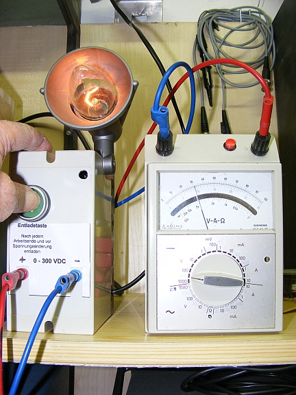 Will ich die Spannung von z.B. 300V auf 100 V herabsetzen, betätige ich ebenfalls die grüne Taste und entleere die Kondensatoren, dabei drehe ich den Trafo gegen Null. Dann stelle ich den Regeltrafo auf 100 V ein und kontrolliere mit dem Spannungsmesser. Die eingestellten 100V können ihre Arbeit beginnen. Die Lampe ist nur für 230 V geschaffen. Aber die kurzen Entladevorgänge hat sie bisher unbeschadet überstanden. Mit 300 V werde ich auch seltener arbeiten.