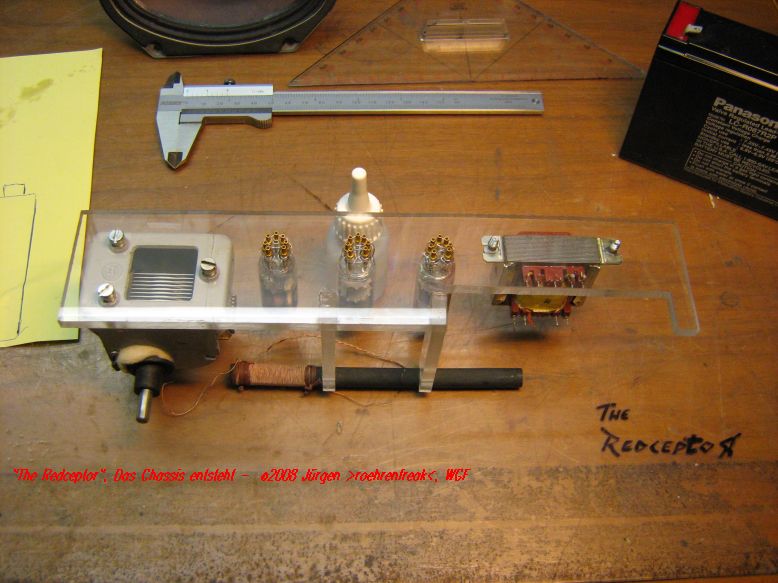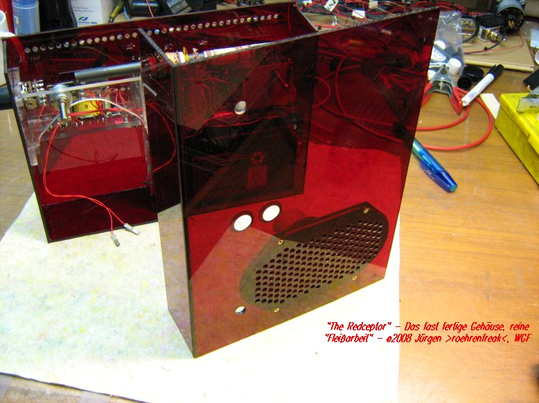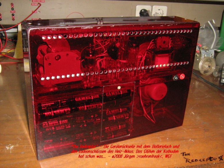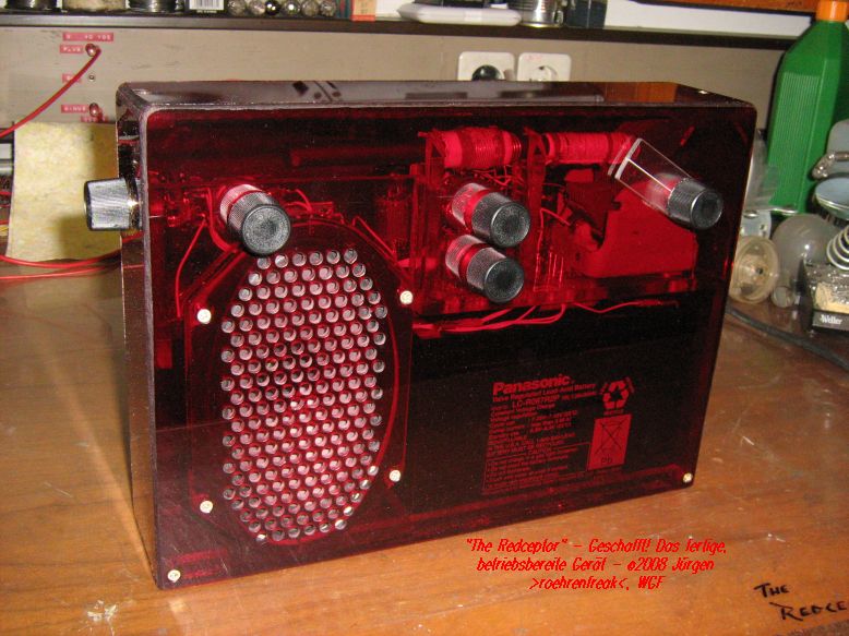 So ungefähr fing es bei mir vor rund sechs Wochen an in den Fingern zu kribbeln. Dann studierte ich auch noch Rainer´s "Black Receptor", eine wunderbar einfach nachzubauende Audionschaltung, die mich mit ihrer Leistungsfähigkeit ganz schön beeindruckt hat - Respekt, lieber Rainer, geht wirklich s..gut! Nun kam noch der Gedanke hinzu, das Radiochen auf Lautsprecherbetrieb "aufzubohren". Nach einigen Experimenten fiel die Wahl auf eine EC92 und eine EL95, welche auch bei einer niedrigen Anodenspannung überraschend gut funktionieren. Langsam aber sicher nahm das Projekt Form an und es wurden folgende Eckdaten festgeschrieben: - Äussere Abmessungen höchstens Kofferradio-Format - Voll Portable-tauglich - Autark ohne Netzanschluss - Mindestens fünf Stunden Dauerbetrieb - Mittelwelle, Kurzwelle ca. 5-11MHz, Langwelle optional - Anodenspannungsquelle aus billigen Mignon-Zellen, es wurden etwa 30Volt angesetzt - und für´s Auge: Ein rotes, transparentes Acryl-Gehäuse Nachdem die Schaltung als Drahtverhau ihre Funktionstüchtigkeit bewiesen hatte ging´s an den festen Aufbau. Nach einer Woche härtestem Schaffen war es denn soweit. Gestatten: Hier ist er
