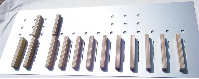 Als weiterer Schritt mussten auf der Frontplatte mit 2-Komponenten Kleber Holzklötzchen befestigt werden, um eine Aufhängung für die Flachbahnregler zu bauen, damit die Frontplatte nachher komplett "Schraubenlos" ist.