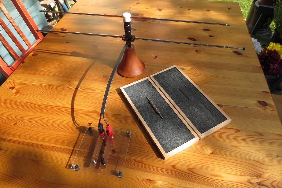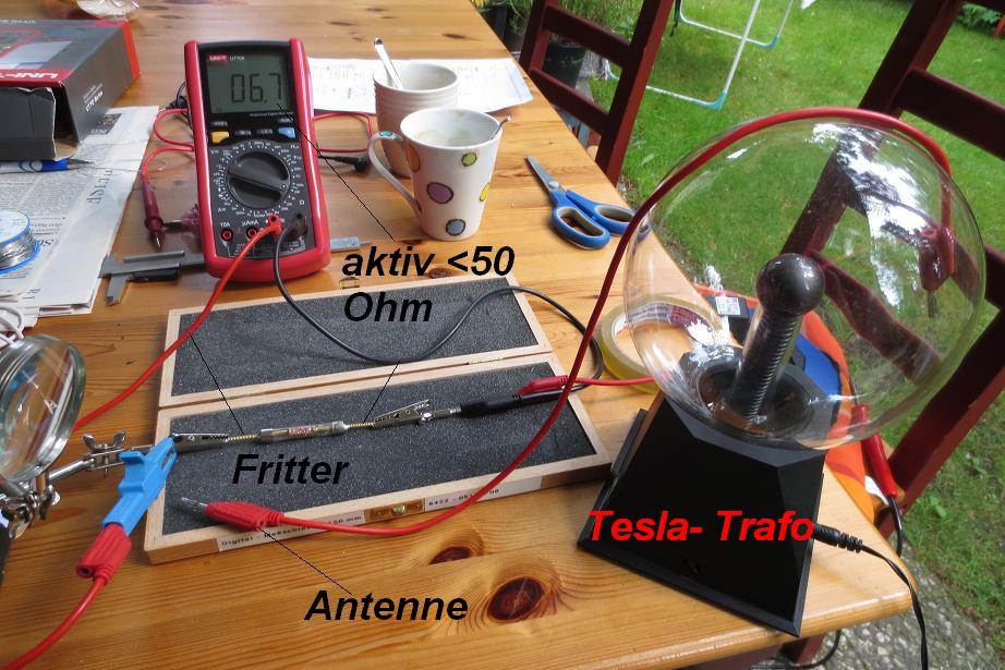 Als Sender fungierte ein Tesla- Dekotrafo in unmittelbarer Nähe des Aufbaus. Antenne eine lose Laborleitung die über die Kunsstoffkugel gelegt wird. Eine zweite Laborleitung wird nun ebenfalls zur Antenne und kurz an den linken oder rechten Fritterkontakt getippt. Das Teil schaltete sofort durch und das Piepen des Messinstruments ließ mich fast vom Stuhl fallen.