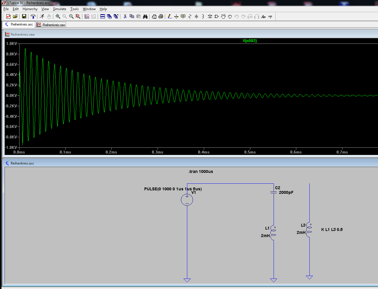 Für eine anständige Funkenstrecke will ich nun eine alte Zündspule vom Moped oder Auto besorgen. Hier zwei Bilder zur Erzeugung gedämpfter Wellen, um mal eine Vorstellung vom Aussehen des Funkensendersignals zu bekommen. (SpiceIV Simulation) Ein 1KV- Impuls simuliert hier den Überschlag der Funkenstrecke (V1). Auf dem zweiten Bild sieht man das Abklingen des Signals bedingt durch die Verluste im Schwingkreis.
