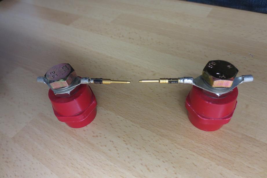 Desweiteren hier die improvisierte Funkenstrecke für die Zündspule. 2x Isolierkörper mit Kabelschuh und eingelöteten Kontakten.