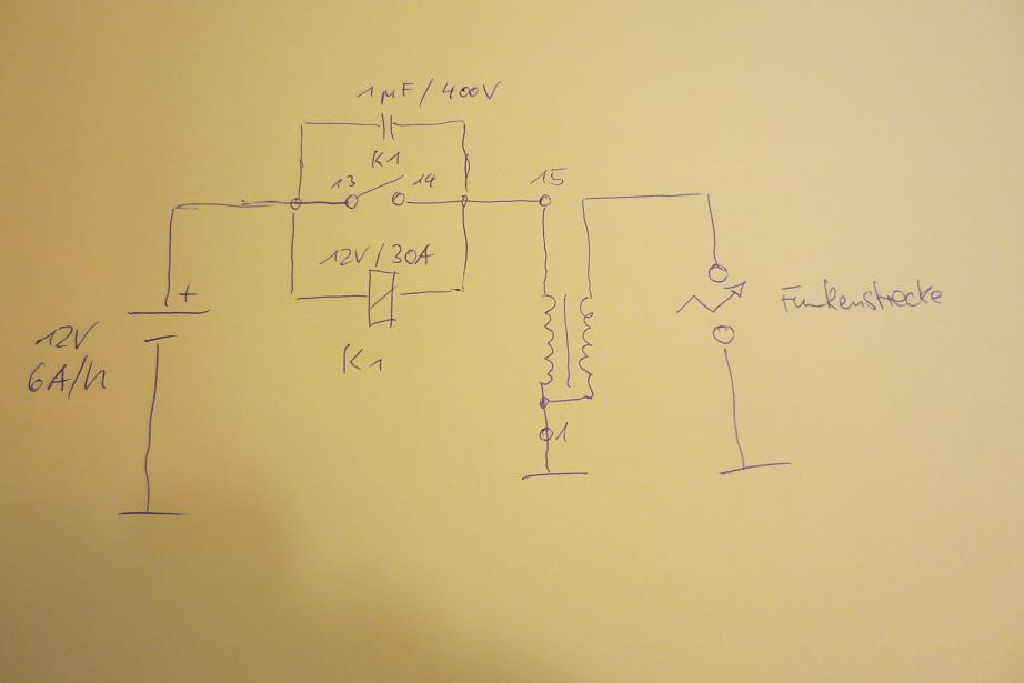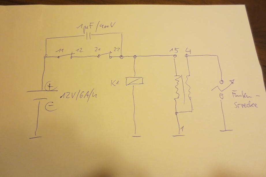 aus einer Zündspule und einem Relais einen Funkeninduktor nachzustellen ist nicht so einfach wie ich gedacht hätte. Zwei Schaltungen habe ich probiert. Nur eine war temporär (ca. 1min) erfolgreich. Lichtbogen ca 10mm.