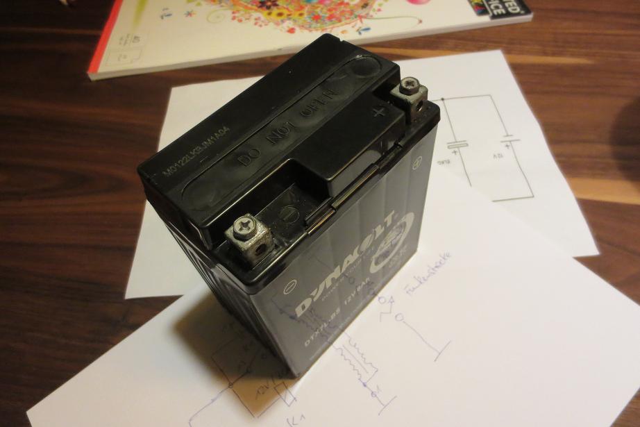 Wenn eine elektromechanische Lösung gesucht wird... dann sollte ein originaler Funkeninduktor nachgebaut werden. Ich werde jetzt die elektronische Variante aus dem obigen Link umsetzen. Hier meine neue Spannungsquelle 12V/6Ah Motorradbatterie. Größenvergleich DINA4 Blätter!