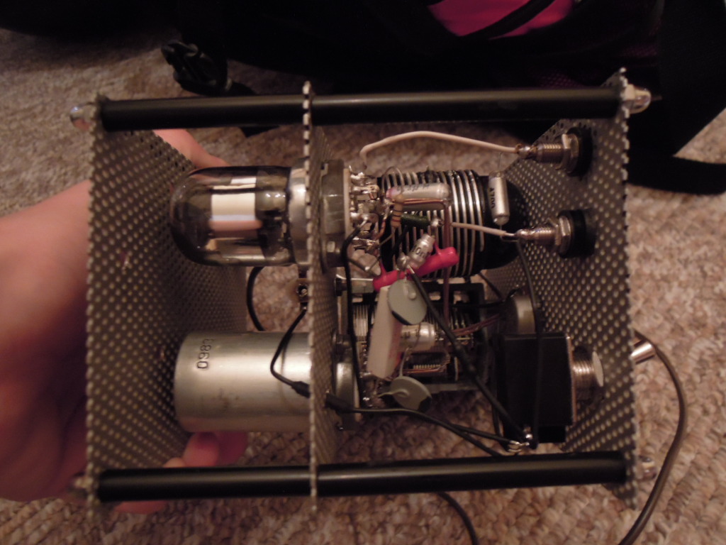 Das Chassis ist aus drei Thelko-Lochblechen, welches mit Gewindestangen und Distanzröhrchen zusammengehalten wird. Das ECO - Audion ist eine 12SH1L, genau wie die NF Stufe. Alles ganz einfache Elektronik. Einen Schaltplan liefere ich noch nach. Der Spulenkörper ist eine Handelsübliche E27 Fassung aus Bakelit. In die "Rillen" habe ich 1,2mm versilberten Kupferdraht gewickelt. Das Patent ist angemeldet :-D