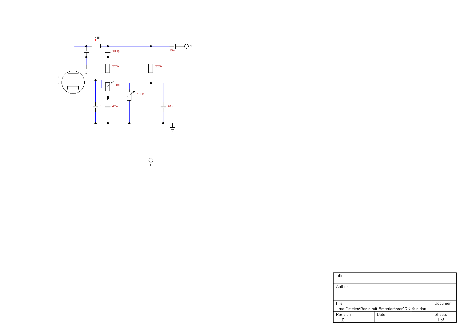 die Dimensionierung der beteiligten Widerstände kann sehr individuell sein. Die in meiner Schaltung angegeben Werte sind keineswegs bindend. Hängt zum einen von den gewählten Betriebsspannungen, der Schaltung selbst oder auch von der jeweils verwendeten Röhre ab. Mich würde interessieren mit welchen Schirmgitter/Anodenspannung eure Schaltungen arbeiten bzw. zu schwingen beginnen und mit welcher Röhre. Ich verwende gerne EF 80/89/95 oder DF91/92/96.