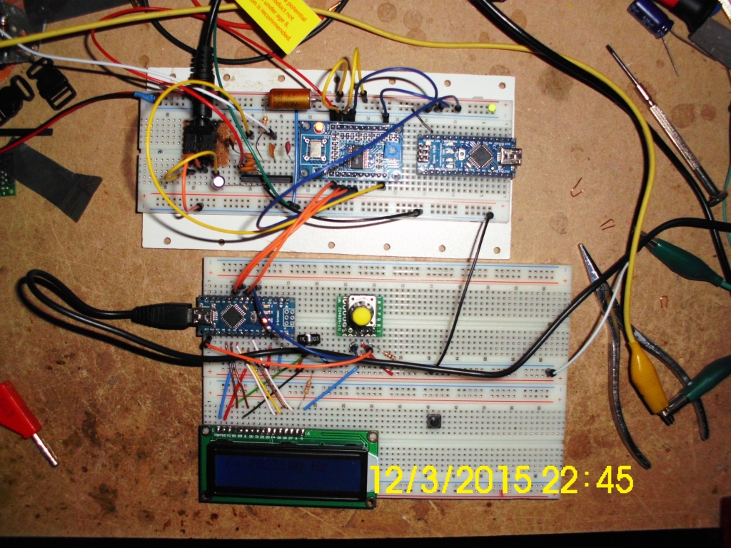 Der Empfängerschaltkreis ist ein TA7358 gefolgt vom programmierbaren Oszillator und dem Arduino. Die Frequenz wird über eine serielle Konsole zum Arduino übertragen der dann den Oszillator auf die Frequenz stellt.