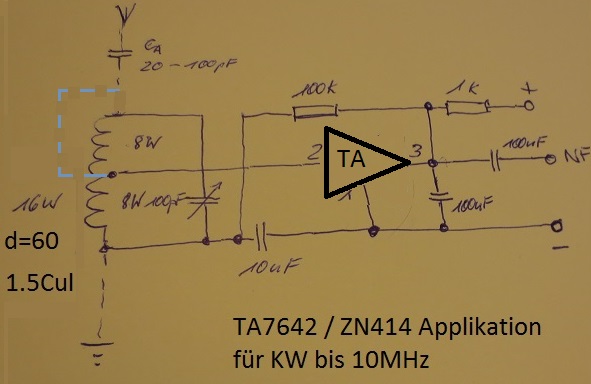 ich weiß nicht wo Du die Schaltung her hast....aber diese ist leider fehlerhaft. Mark hat recht. Der ZN und der TA sind gleich. Hier meine KW- Applikation. Den Anschluss 2 kannst Du auch noch tiefer zum kalten Ende der Spule legen....einfach empirisch ermitteln. Bis ca. 10MHz funktioniert der Chip sehr gut. Den Antennenanschluss kannst Du auch nach Deiner Schaltung aufbauen. Gut ist es die Antenne über ein kleines C an einen unteren Abgriff der Schwingkreisspule zu legen.