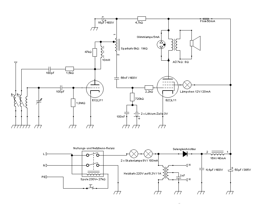 Besonderheiten der Schaltung: - Spartrafo als Zwischenübertrager. Die Kopplungsweise gleicht der Drosselkopplung. - Skalenlämpchen reduzieren die lokalen 230V auf 220V. Dadurch liefert der alte Heiztrafo, den ich zum Glück noch gefunden habe, exakt 6,3V - besonders kleiner Ladekondensator, Holchleistungs-MKT-Typ. Zusammen mit der Drossel bewirkt er in den Halbwellen-Pausen eine zügige Entladung (Brummspannung an der Stelle >100V) und damit eine geringere Spannungs-Belastung des Selengleichrichters in der Sperrphase (U sperr = U Netz neg Spitze + U Ladekondensator). Weiterhin bewirkt diese Maßnahme eine starke Verringerung des Ripplestroms. - Schirmgitter-Sicherung, visuelle Schirmgitterstrom-Anzeige und UKW-Schutzwiderstand durch Lämpchen 12V / 20mA - Überspannungsschutz bei offenem AÜ-Ausgang durch Glimmlampe - Gitterbatterie, dadurch Fortfall des Widertsandes in der Minusleitung, Chassis bekommt exakt N-Potential des Netzes - Nullungs-und Netztrenn-Relais, verhindert Einschalten wenn die Netzphase auf dem Chassis zu liegen käme. Achtung, ersetzt keine galvanische Netztrennung! Gerät ist bzgl. Berührungsschutz wie Allstromgerät zu behandeln!
