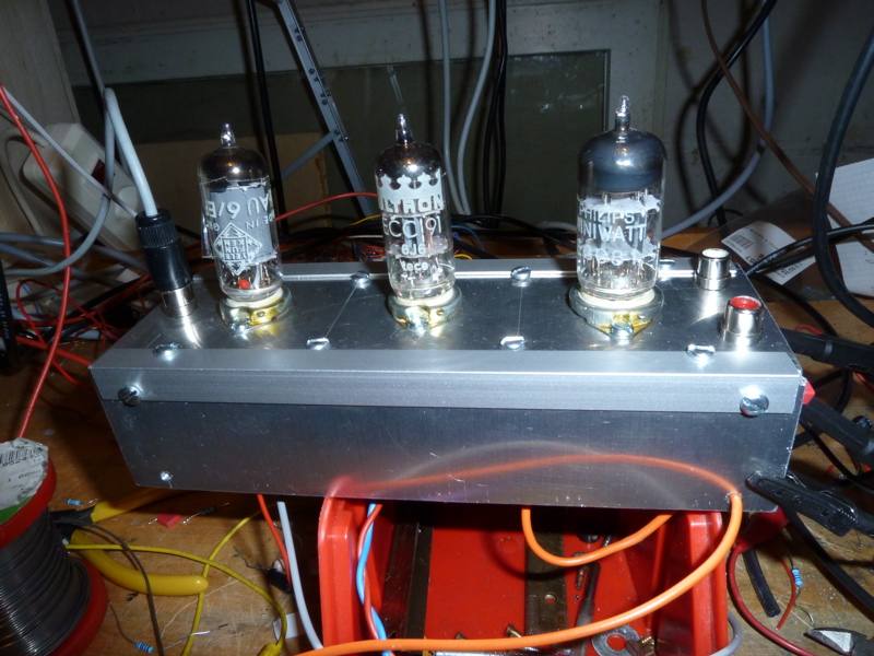 Die EF94 verstärkt das Multiplex-Signal und filtert mit dem Schwingkreis den 19kHz-Pilotton heraus. Hier steckt die grösste Herausforderung, denn der Pilotton hat nur etwa 10% der Signalamplitude, und Reste der Modulation auf dem ausgefilterten Pilotton stören die Dekodierung. Hier ist vermutlich noch ein zweites Filter am Eingang notwendig. Die ECC91 arbeitet als Frequenzverdoppler, um aus dem Pilotton wieder den 38kHz-Hilfsträger zur Demodulation des Differenzsignals zu erzeugen. Die Funktion ist im Prinzip eine Vollwellengleichrichtung mit Verstärkung, ähnlich wie beim Audion, aber doppelt. Die Steuerspannung ist so hoch, dass die Trioden während der negativen Halbwellen vollständig sperren. Somit leitet durch die gegenphasige Ansteuerung bei jeder Halbwelle des 19kHz-Signals eine der beiden Trioden, so dass der Anodenstrom eine Frequenz von 38kHz hat, welche durch den Schwingkreis ausgefiltert wird. Auf der Sekundärseite des Ausgangstrafos wird dem 38kHz-Träger das Multiplexsignal über die Mittelanzapfung hinzugefügt. Dadurch entsteht ein amplitudenmoduliertes Signal, bei dem die eine Hüllkurve dem linken und die andere dem rechten Audiosignal entspricht. Durch die symmetrische Sekundärwicklung hat man zwei gegenphasige Signale, so dass man für beide Audiokanäle die positive Hüllkurve demodulieren kann. Die Demodulation übernimmt die ECC81. Der Arbeitspunkt ist so gelegt, dass die Röhre ohne Ansteierung gesperrt ist. Die positiven Halbwellen steuern die Röhre auf und liefern so an der Anode das NF-Signal, während die negativen gesperrt bleiben. Am Ausgang folgt noch ein aufwendiges LC-Filter, das die Frequenzen über 20kHz (38kHz-Schaltfrequenz samt Seitenbänder) unterdrückt. Damit die Verzerrungen klein bleiben, müssen die Amplituden der Signale und der Arbeitspunkt passen, hier bin ich noch am Optimieren. Die negative Gitterspannung beziehe ich mittlerweile von den Gittern der ECC91. Diese Spannung ist nur bei einem Stereosignal vorhanden, so dass bei Mono-Empfang die ECC81 ohne negative Gitterspannung im normalen A-Betrieb das Eingangssignal verstärkt. Erste Messungen zeigten eine Kanaltrennung von 30..40dB und ein Klirrfaktor kleiner als 1%, was gar nicht so schlecht ist. Hier noch die Bilder des Aufbaus:
