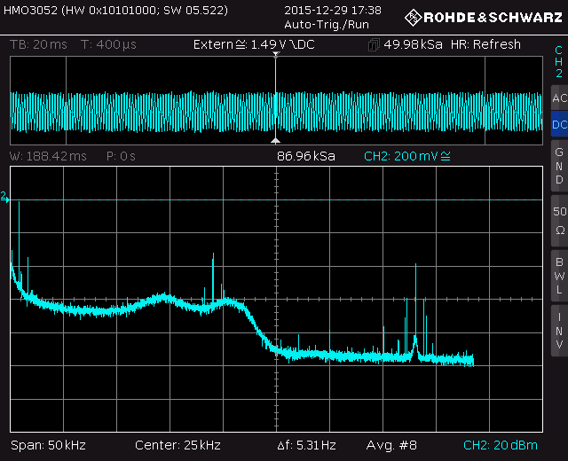 Zum Schluss noch das NF-Spektrum über eine Breite von 50kHz (5kHz/Div und 20dB/Div). Hier sieht man die Wirkung des Ausgangsfilters, das ab etwa 22kHz mit 40dB dämpft und so den systembedingt sehr starken 38kHz-Hilfsträger kräftig dämpft, so dass er etwa 40dB unter der NF-Amplitude ist und damit keine Probleme mehr bereiten sollte. Der 19kHz-Pilotton wird nicht weggefiltert, da sonst die Eckfrequenz tiefer sein müsste, was den NF-Frequenzgang stört. Da der Pilotton gemäss Norm nur 10% der maximalen NF-Amplitude hat (und damit nur 1% der Leistung), sollte damit jeder Hochtöner klarkommen, der bekommt so bei einer Spitzenleistung von 100W gerade mal 1W vorgesetzt. Die Welligkeit zwischen 15kHz und 20kHz kommt vom Filter, denn für diese Steilheit muss sowohl im Durchlassbereich als auch im Sperrbereich eine Welligkeit in Kauf genommen werden. Da das NF-Signal senderseitig bei 15kHz abgeschnitten wird, stört diese Welligkeit nicht gross, durch den leichten Anstieg gegen 15kHz wird der Ton etwas heller. Durch einen nachgeschalteten RC-Tiefpass kann das noch korrigiert werden.