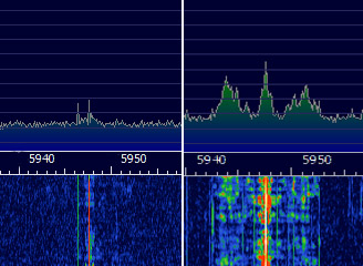 Betrachte ich die Antenneneingänge des DE32-Koppler, so muß nach Rothammel doch die Frage gestellt werden, wie symmetrische Speiseleitungen an den Koppler angeschlossen werden sollen. Fehlt dem Gerät dazu nicht noch ein eingebauter Balun? Ich bin der Meinung die Eingangsschaltung müsste so aussehen wie in meinem Bildanhang "Symetrierung". Leider war ich so dumm und habe den Eingang meines Experimentiergerätes genauso nachgebaut wie auf den Bildern des DE32 gezeigt. Das werde ich in der entgültigen Version noch abändern! Die Empfangsergebnisse sind aber jetzt schon überzeugend. Ein bereits starkes Signal wird dadurch natürlich nicht stärker, muss es auch nicht, aber die ganz schwachen Signale auf der Kurzwelle werden erst durch eine Anpassung hörbar! Ich habe dazumal eine ganz schwache Station mit dem SDR gesucht. Auf dem 49m Band sendete Radio Rumänien in wahrscheinlich russischer Sprache. Man sieht links die Station an 10m Draht. Rechts wurde an der selben Antenne der Koppler eingesetzt.