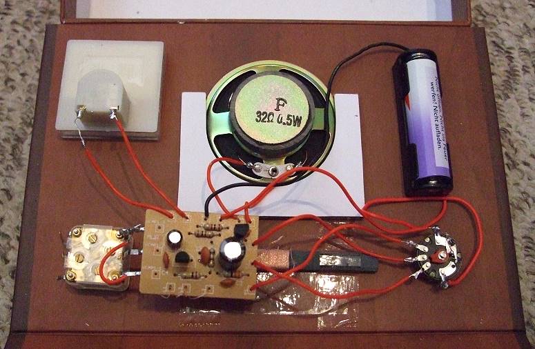 Es ist ein Einkreiser mit Verstärker-Demodulator/Regelspannungs-Schaltkreis und einstufigen Transistor-NF-Verstärker mit Lautsprecher und 1,5 Volt Betriebsspannung und Batterieanzeige und Feldstärkeanzeige.