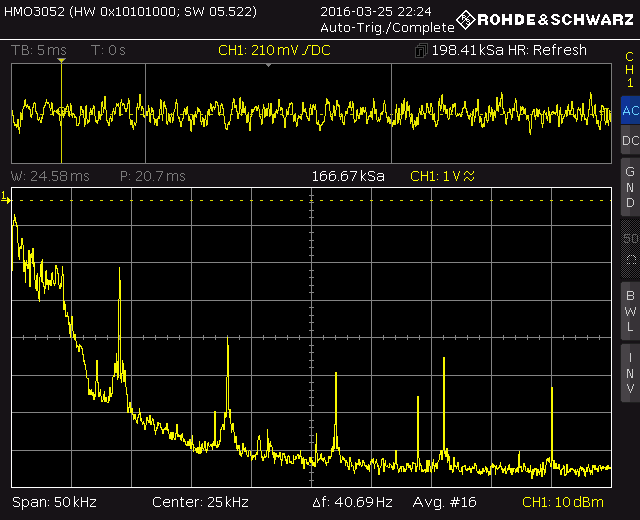 Heute abend habe ich noch Bandbreitenmessungen auf MW mit dem provisorischen Bandfilter gemacht. Das geht am besten, wenn man das NF-Spektrum ansieht, da ja die AM-Demodulation nichts anderes als eine Frequenzverschiebung ist. Hier mal die Bilder mit verschiedenen Rückkopplungseinstellungen, die Empfangsfrequenz betrug etwa 1.2MHz, die Frequenzskala ist 5kHz/Div und die Amplitudenskala 10dB/Div.