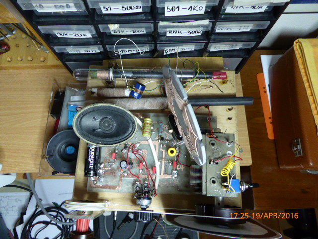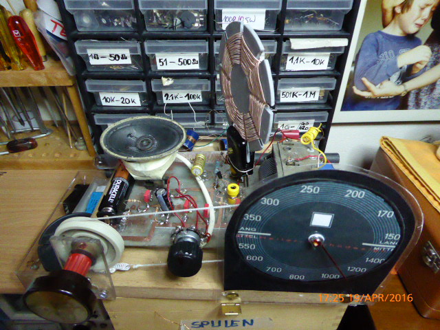 Verstaubt, aber funktioniert noch. Da habe ich letzt eine Flachspule mit 800 µH eingestzt. Drehko 2 X 500 Pf (zuschaltbar Paralell) was dabei herausgekommen ist: