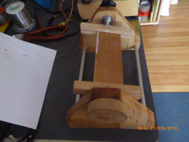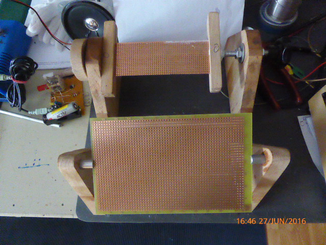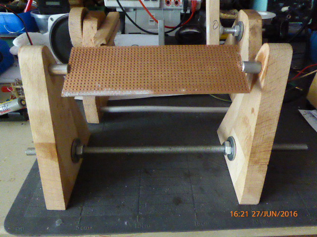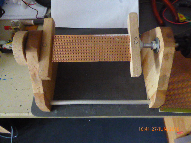 das weckt Erinnerungen in mir. Seit ich vor fast 39 Jahren von Hessen nach Bayern gezogen bin arbeite ich in einer japanischen Firma. Meine erste Tätigkeit war Platinen zu bestücken und zu 'wrappen'. Für diese Verdrahtungstechnik wurde ein Metallhalter verwendet, der Deinem Halter aus Holz ähnlich sieht. Leider habe ich den Halter nicht mehr. Was aber wichtig war, war eine Rändelschraube am oberen Ende eines Seitenteils vom Halter. Hiermit konnte man die Halteachse für die Platine auf einer Seite fesstellen, wodurch sich die Platine beim bestücken und wrappen nicht mehr verdrehen konnte.