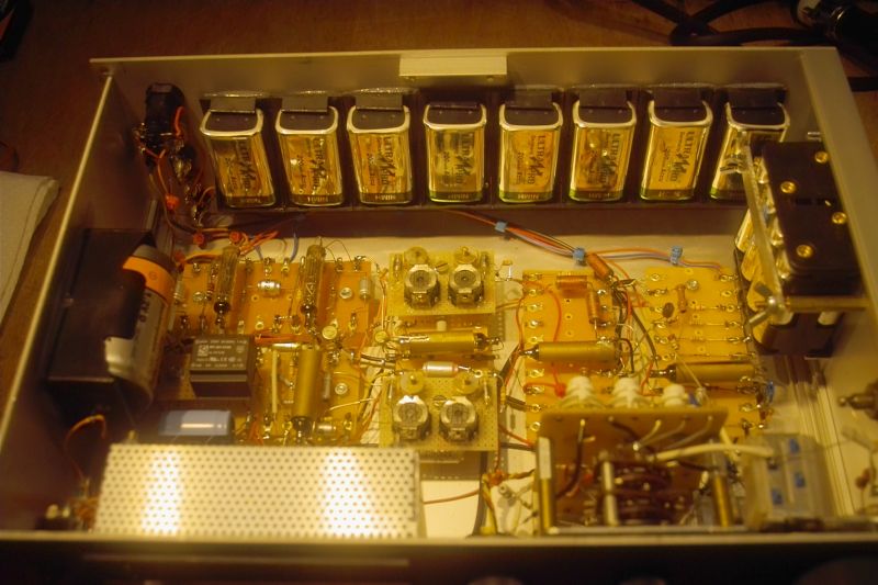 Die Stromversorgung wurde komplett mit 3 Akkupacks realisiert und der jeweilige Ladezustand ist über weitere Displays ablesbar. Die Gesamtanodenstromaufnahme des Empfangszugs beträgt im Mittel ca. 3 mA bei 75V, wobei der Querstrom durch die drei Einstell-Potis bereits die Hälfte davon ausmacht. Heizstrom fließt ca. 80mA und die Displays brauchen etwa 90mA bei 10Volt. Die Empfangsleistungen sind absolut zufrieden stellend und dank der vielen Einstellmöglichkeiten sehr flexibel an die jeweilige Signalstärke anzupassen. Der ZF-Verstärker kann meist auf geringster Verstärkung eingestellt bleiben, da das Audion sonst schnell übersteuert wird.