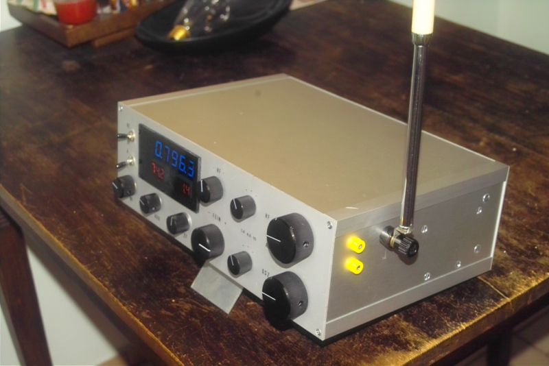 Ein kleiner Schwachpunkt aber bleibt. Im oberen Empfangsbereich wird der Oszillator etwas mitgezogen. Dank der genauen Frequenzanzeige ist der Empfänger aber leicht wieder zu korrigieren. Eine Lösung habe ich noch nicht, stört mich allerdings auch nicht wirklich. Als Antenne dient eine relativ lange Teleskopantenne, die mal für CB-Handfunken gedacht war und hier an der Gehäuseseite angeschraubt wird. Anschlüsse für Langdrähte gibt es auch.