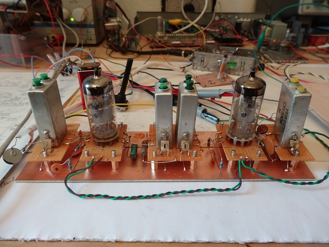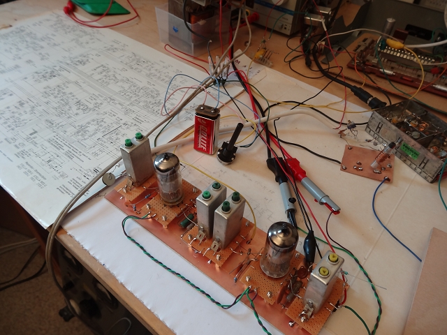 Ein aktuelles Beispiel: Nachbau eines Bild-ZF-Verstärker mit der EF 183/184 aus der Serie INES/STELLA (RFT Stassfurt), noch mit Industriefiltern. Diese Schaltungen findet man in vielen TV in Ost und West (GRAETZ z.B. als West-Beispiel mit anderen interessanten Filterkonzepten). Der Hauptcharme ist, das im Gegensatz zu Transistoren und EF80-Röhren nur zwei Röhrenstufen für den B-ZF-Verstärker erforderlich sind (sehr hohe Steilheit der EF183/184-Röhren). Erstaunlich finde ich, daß es bei ordentlichem Aufbau sofort "funktioniert" hatte im Sinn von "Bild da", obwohl die Filter vor vielen Jahren rel. grobmotorisch aus alten Platinen "gerupft" wurden. Bei anderen Experimenten konnte ich "beweisen", daß auch der Bild-ZF-Verstärker kein Hexenwerk ist wie in der Fachliteratur oft zuunrecht dramatisiert (kritischer Abgleich etc) und man auch mit selbstgewickelten Filtern zu brauchbaren Ergebnissen kommen kann, ohne große HF-Messtechnik (Wobbler/Prüfgenerator)...das ist noch andere Geschichte, später ggf. mehr.