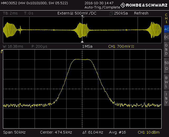 Hier noch das Spektrum am NF-Ausgang, empfangen wurde ein schwacher Gleichwellensender. Im Zeitbereich (oberer Teil) sieht man die 5Hz-Schwebung der beiden Gleichwellensender, die etwa gleich stark ankamen. Im Spektrum sieht man das NF-Signal vom Sender mit 4.5kHz-Bandbreite, danach Restsignale, weil das Bandfilter noch etwas zu breit ist, und bei 8kHz ist schon sehr dicht. Der schwache Peak bei 9kHz ist einer der beiden Nachbar-Träger.