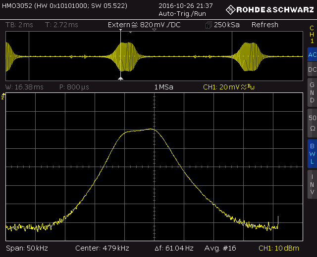 Hier noch eine Messung mit einem realen MW-Sender (als Front-End diente mein Biennophone, das ZF-Signal wurde direkt an der Anode der Mischröhre abgenommen). Gelb ist das ZF-Signal am Demodulator-Eingang, hellblau das synchronisierte Taktsignal, das hier zur Triggerung verwendet wurde. Man sieht, dass es sauber synchron ist, trotz des relativ starken Rauschens des ZF-Signals.