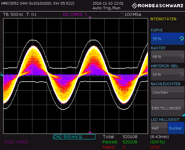 Hier noch eine Langzeitmessung. Das mit 100% amplitudenmodulierte Signal ist in Falschfarben dargestellt, die beiden weissen Linien sind die Grenzen für einen Fehler. Man sieht, dass die Phase trotz extremer Modulation (und mit 10Hz sehr tiefer Modulationsfrequenz) praktisch konstant bleibt (die Nulldirchgänge sind immer am selben Ort). Als Trigger diente das durch die PLL stabilisierte Oszillatorsignal, so dass sich ein Synchronisationsfehler in einer Phasenverschiebung bemerkbar machen würde, womit die Kurve in den 'verbotenen' Bereich rutschen würde.