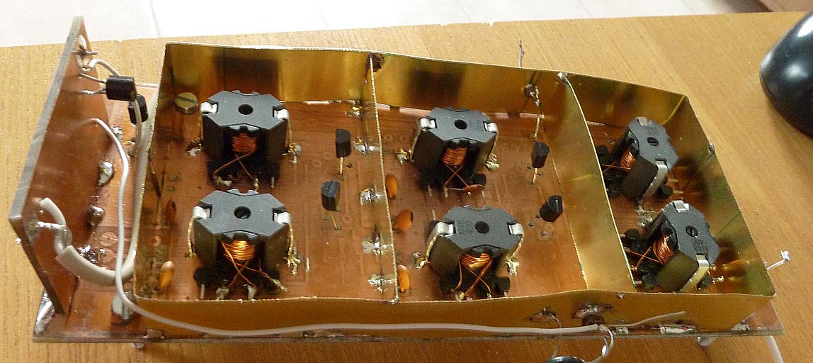 das kommt alles auf Leiterplatten, der ZF-Verstärker und AGC ist schon drauf (Bild), allerdings nicht industrietauglich... Bei Halbleiterschaltungen ist das nach meiner Meinung die einzig gute Lösung. Aufbauten auf einer Kupferfläche sind zwar HF-mässig gut, aber schummelig und mechanisch schlecht und daher nur für Versuche geeignet. Gerade der Oszillator muss stabil aufgebaut sein, sonst hat man Probleme mit der Frequenzstabilität. Aufbauten auf Lochrasterplatinen taugen für HF nicht viel.