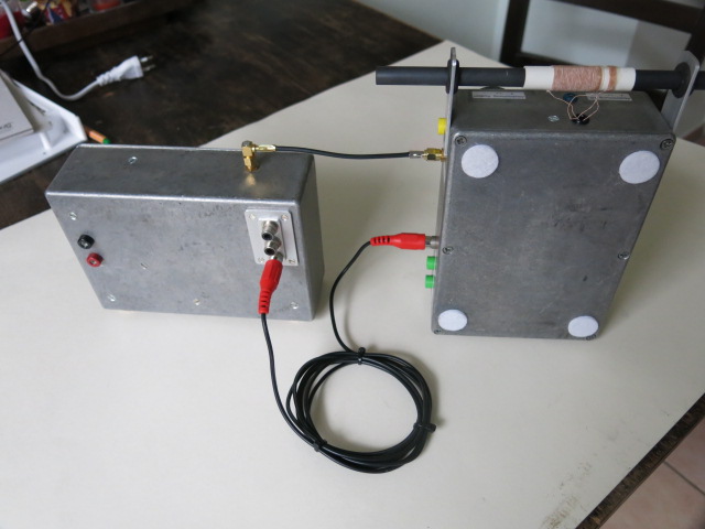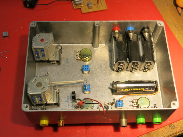 Um das Ganze abzurunden habe ich für das Gerätchen ein Luxuszubehör gebaut. In einer weiteren Alubox befinden sich das Frequenzdisplay und eine 1 Watt-IC-Endstufe. Das Ganze wird über eine 9Volt Batterie versorgt. Damit ist ein recht komfortabler Empfang möglich.