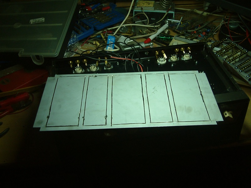 Die Buchsen sind aus der Bucht, die Lautsprecherbuchsen aus China importiert. Chassis, Blechtteile, Lötleisten etc. alles selbstgemacht, entsprechend groß ist der Bastelspaß. Die Planung vom Aufbau war eine Herausforderung, 12 Röhren bei einer Bautiefe von 20cm bis zur Trennwand, das ist schon etwas eng.