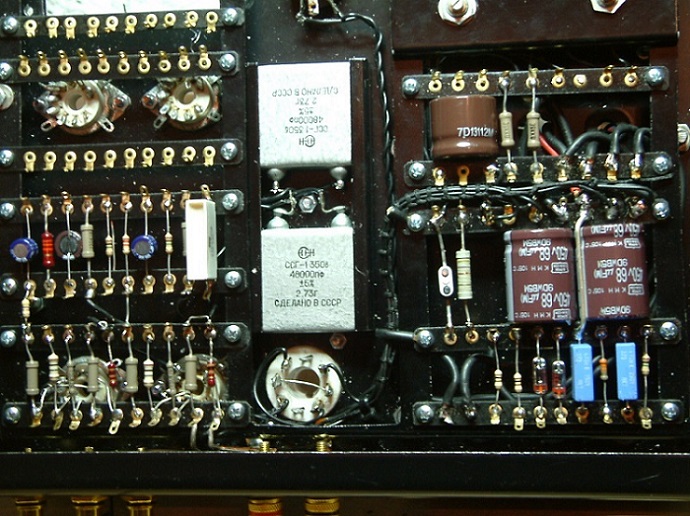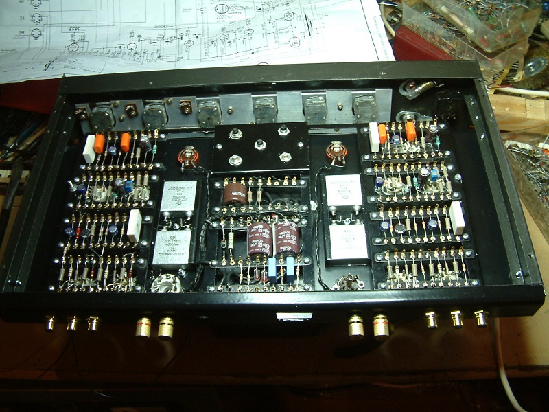 Bauart: Lötleistendesign, mit Kabelbaum und Knötchen. optimierte Leitungsführung, sowenig und so kurz wie möglich, strenge räumliche Trennung von Signalkabeln und Wechselspannungen empfindliche Teile sollen abgeschirmt sein Anordnung von Transformatoren so daß möglichst geringe / keine magnetische Kopplung untereinander erfolgt Alle Bauteile in Reih und Glied ! Getrennter Aufbau der beiden Kanäle und der Versorgung Selbstgemachte Lötleisten aus Epoxy, genietet. Trägerrahmen innen (wenig Schrauben im Chassis) zeitgemäße Anschlußbuchsen. neues Chassis anfertigen. Designvorgabe: ein richtiger Imperator ist schwarz !
