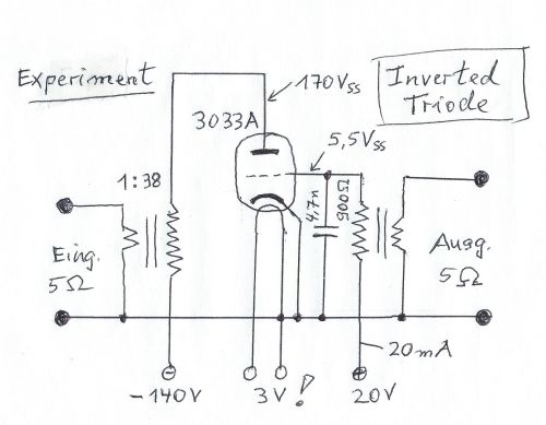 Vor vielen Jahren habe ich mal Diskussionen in einem anderen Forum mit Argwohn verfolgt: Es ging um einen Hi-Fi Endverstärker mit einer Triode, welche andersherum also "inverted" betrieben wird. Das Steuersignal liegt an der negativen Anode und der AÜ am positiven Gitter!!