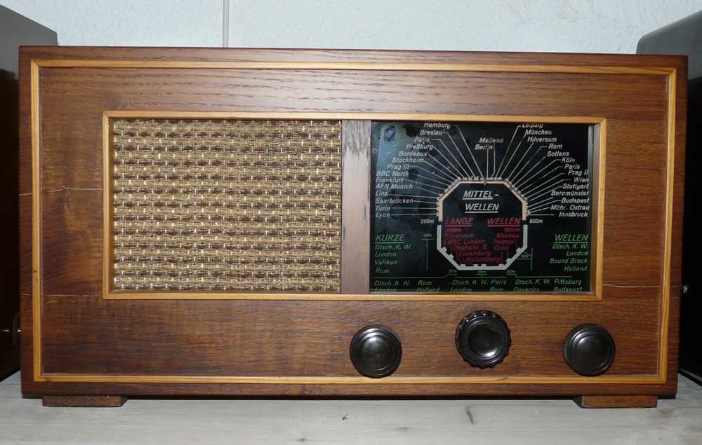 Gratulation zu diesem Gerät. Ich kann hier nur eine Geschichte aus meinem Leben beitragen. Damals Anfang der 1950er Jahre hatten meine Eltern ein Sofa in der Küche und darüber ein Bord. Darauf stand ein Radio mit ähnlichem Aussehen. Als kleines Kind stieg ich auf das Sofa und habe die Skala des Radios mit der Tabakspfeife meines Vaters zerschlagen. Da hat mir wohl das Rundfunkprogramm nicht gefallen. Mit so einer Vergangenheit dürfte man ja garnicht hier im Forum sein. Später erfuhr ich, die damals vielen kleinen Radiowerkstätten haben nach dem Krieg selbst Geräte aus Altteilen hergestellt und verkauft. Also viel Spass und das Gerät immer vor Kinderhänden schützen.