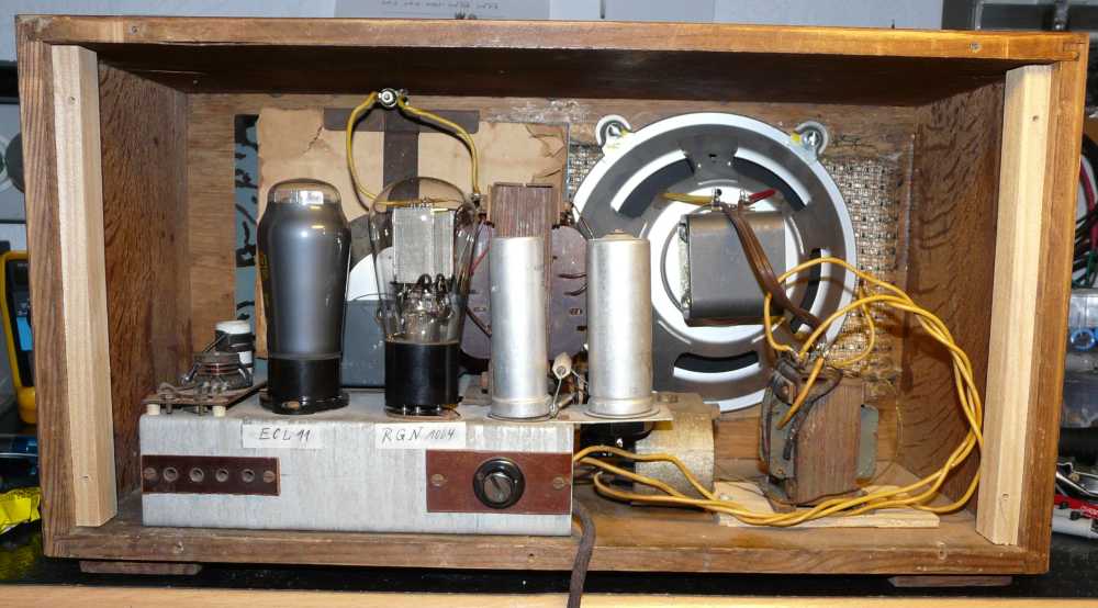 Daß es sich um eine Audioschaltung handelt, wissen wir schon. An Röhren verbaut sind ECL11 und RGN1064. Als Siebung haben wir eine Drossel und 2x 47µF/450V=. Die Rückkopplung erfolgt über einen kleinen Drehko, ein sog. "Quetscher". Und sogar ein Klangregler (Höhenabsenkung) ist da, gekoppelt mit dem Ein/Aus-Schalter, und besteht aus einem 100nF-Kondensator und 100KOhm-Poti. Leider war aber hier das originale Poti abgeraucht, vermutlich ging unserem Bastler mal der Koppel-C kaputt, und so lag die volle Anodenspannung am Poti, und das war ihm dann doch zuviel. Ich habe es ersetzt, und die Geschichte funktioniert recht gut.