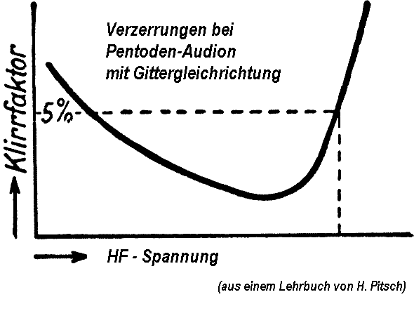 Ja, es ist bekannt, dass das Audion (Gittergleichrichtung) nur bei bestimmten HF-Eingangspegeln verzerrungsarm arbeitet. Daher ist eine gute Dosierung der HF erforderlich. Diese Grafik stammt noch aus einer Zeit, wo die Rundfunksender zu 60% in der Spitzen(!) modulierten!