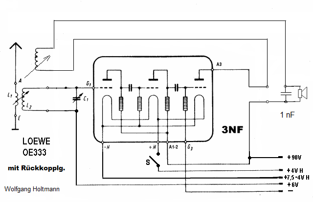 Ohne viel Aufwand und ohne Eingriff ins Gerät kann man m.E. eine Rückkopplung hinzufügen. Die Empfindlichkeit müsste ansteigen, was noch auszuprobieren ist. Ich selber habe keinen OE333 und nur eine schwache 3NF. In der 3NF gelangenen Restanteile der HF bis zur Anode der Endröhre!