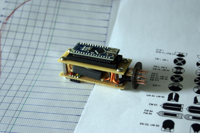 So mein Prototyp ist fertig. Er besteht aus einem Basismodul für mehrere LED-Bildschirme und zum Einstecken in eine Röhrenfassung. Die Betriebsspannunng für alle Komponenten (Prozessor, OLED, Operationsverstärker usw.) wird aus der AC-Wechselspannung für die Heizung gewonnen.