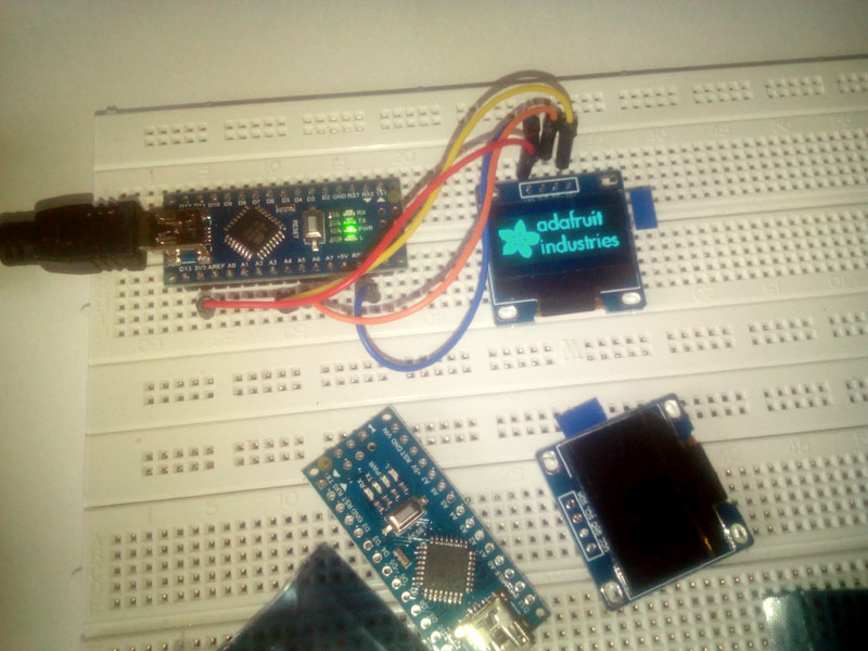 Arduino Nano mit OLED. Es läuft das Beispielprogramm der Adafruit GFx-Bibliothek.