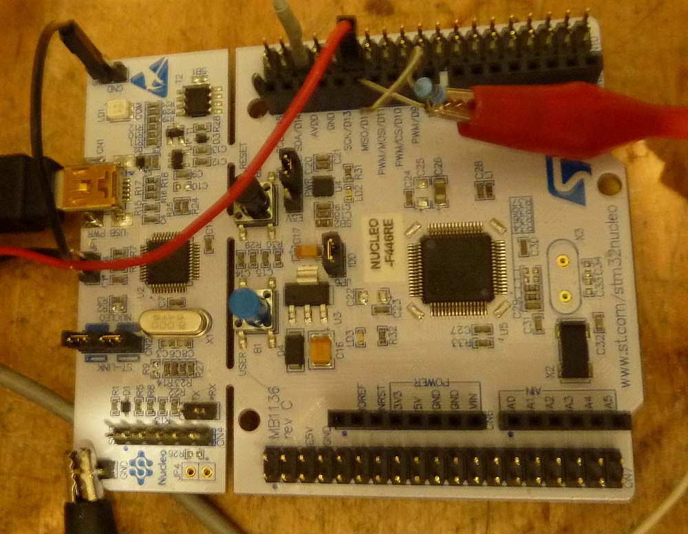 Als Basis dient ein Nucleo-F446RE-Board von ST Microelectronic. Das hat einen ARM-Cortex-M4 mit 180MHz Takt, A/D- und D/A-Wandler mit 12 Bit Auflösung, mehr als genug RAM und FLASH und auf einem abtrennbaren Teil eine Debug-Schnittstelle mit USB-Anschluss an den PC, und das Ganze ist für weniger als 20 Euro zu haben, also richtig bastlerfreundlich. Ebenfalls nützlich ist der auf dem Debug-Teil integrierte Umsetzer von RS232 nach USB, so bekommt man gratis eine Kommunikationsschnittstelle zu Testzwecken.