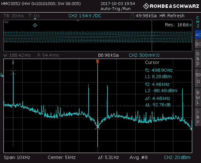 Das Sinussignal ist beim Cursor 1, bei Cursor 2 ist die dezimierte Samplingfrequenz von 50kHz und links und rechts davon die Aliasfrequenzen. Die erste Harmonische ist noch knapp sichbar und etwa 55dB unter der Grundwelle, was schon recht nahe an der Spezifikation des D/A-Wandlers liegt. Die kleineren Peaks sind Störungen, vermutlich Einkopplungen von digitalen Signalen, da der Messaufbau nicht perfekt ist, aber für erfolgsversprechende Versuche ist die Signalqualität auf jeden Fall ausreichend, und der A/D-Wandler arbeitet sehr sauber.