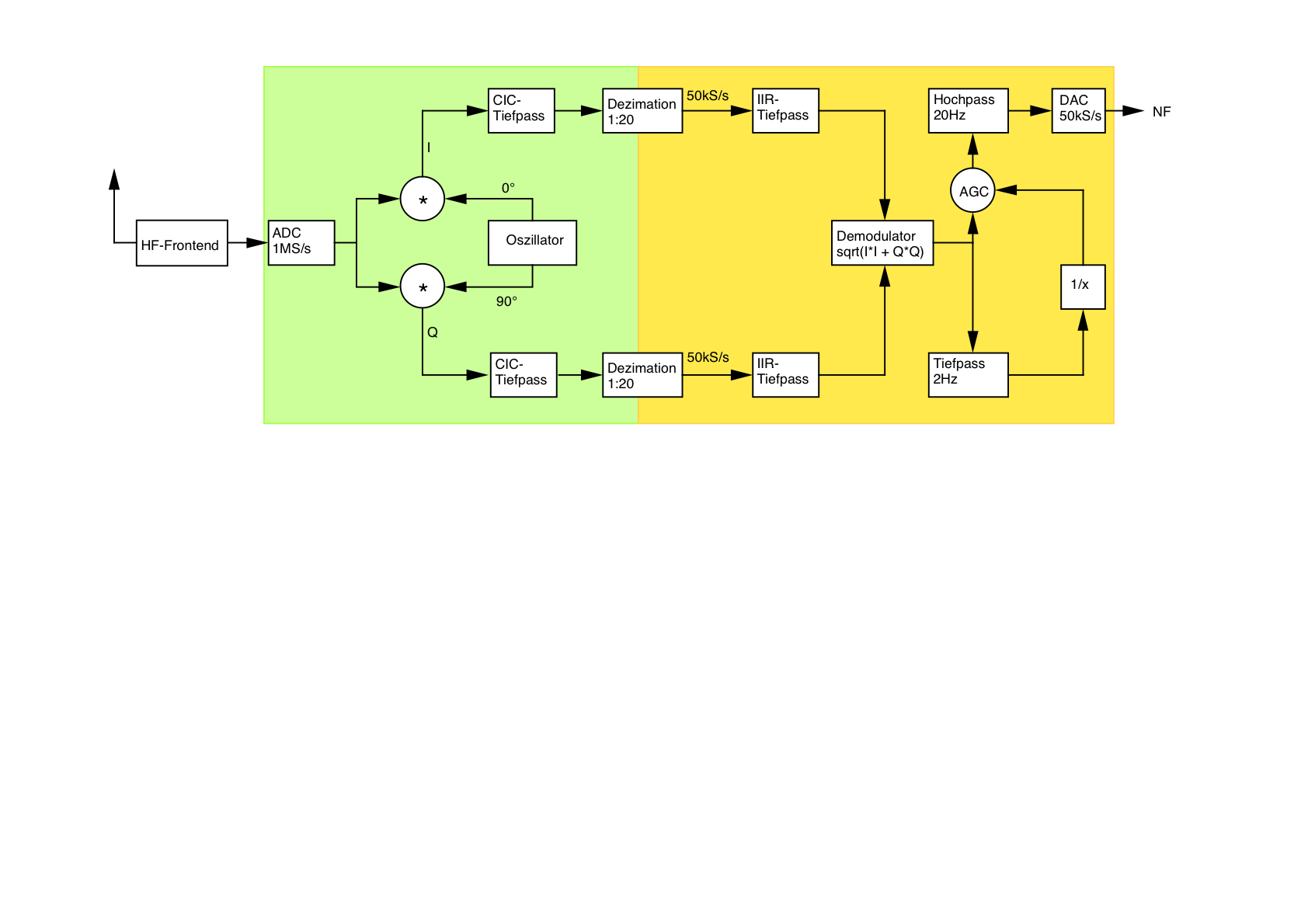 Zuerst ist links das analoge HF-Frontend (das noch nicht existiert). Falls man nur Frequenzen unterhalb 500kHz empfangen will, reicht hier ein Tiefpassfilter zur Verhinderung von Aliasing, sowie ein Verstärker mit allenfalls umschaltbarer Verstärkung. Für Frequenzen über 500kHz ist das HF-Frontend ein klassischer Mischer und das vorgefilterte ZF-Signal gelangt an den A/D-Wandler.