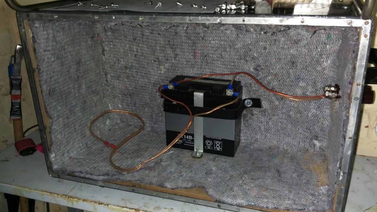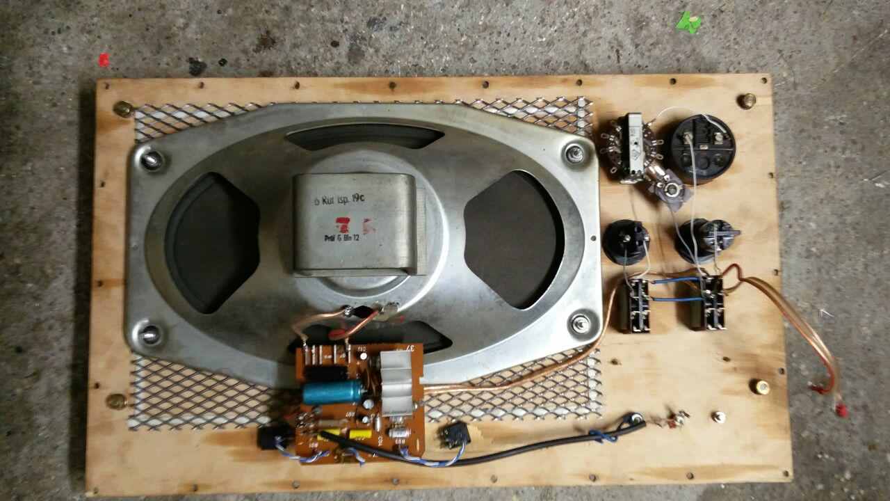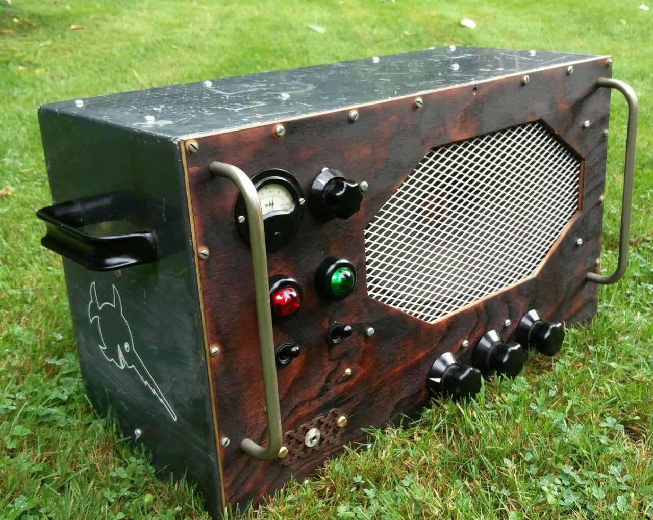 Ich hatte noch einen großen Basslautsprecher aus einem Röhrenradio... ich erinnerte mich, dass ich den schon mal an so einer kleinen A210 Platine am laufen hatte und das gar nicht schlecht war. Also so eine Platine rausgekramt... Gehäuse - unterm Tisch steht doch noch das Gehäuse eines geschlachteten Cartex - Prüfgenerators? Jap, steht! Dann wurden noch allerhand große Bauteile zusammengesucht und zum Kumpel gefahren, Frontplatte "Designen". Am nächsten Tag dann zurechtgesägt, gefeilt und gelocht.... Nur war die Buchensperrholzplatte zu klein... Also nochmal Baumarkt. Alles nochmal, aufs Gehäuse schrauben und Abflammen. Ich habe das mit so einem kleinen Unkrautbrenner gemacht. Danach mit dem Messingbürstenaufsatz für die Bohrmaschine die Kohleschicht abtragen, bisschen mit Schleifvlies glätten und dann mit lecker Altöl (10W40, teilsynth.) bepinseln. Eine Nacht einziehen lassen und nochmal drüber polieren und fertig. Dann den ganzen Mist draufschrauben und ja aufpassen, dass nichts klappert/scheppert. Und bitte mit dem Streckmetall aufpassen, die Ecken/Kanten gehen gut ins Fleisch... Das Gehäuse habe ich mit 10mm MDF ausgekleidet, mit Dachdicht verklebt (dumme Idee, stinkt bestialisch und braucht ewig zum Trocknen) und zusätzlich noch geschraubt. Dann noch eine Umzugsdecke zerschnippelt und mit Montagekleber für Dämmplatten verklebt (bessere Idee). Eine 12Ah Motorradbatterie dient als Energiespender. Zum Laden sind + und - an zwei Klemmen nach außen geführt.