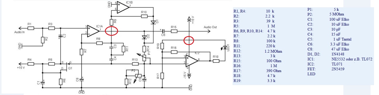 die Info über die Verbindungspunkte ist plausibel und die Schaltung taugt nichts (aus meiner Sicht). Der regelnde FET addiert neben seiner Regelfunktion niederfrequent die Regeländerung als schwankenden Offset auf das NF-Signal über C2. Außerdem mußt Du aufpassen, daß die Übersteuerungs-/Limitanzeige mit Ihrem Trigger Dir nicht Schaltspitzen auf Dein NF-Signal bringt, das erfordert einen sauberen Aufbau mit guter Abblockung der Betriebsspannung (IC2 und LED sollten nicht direkt an +15V hängen sondern über Widerstand und Elko gegen Masse, die Masse muß klug verlegt werden - selbst Revox hatte mit einer ähnlichen Übersteuerungssanzeige Probleme beim Tonbandgerät A77). Ich würde mir eine andere Schaltung suchen.