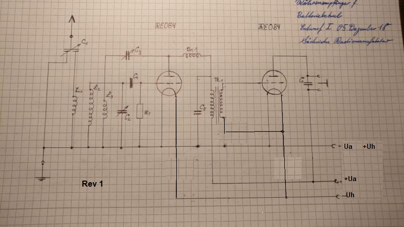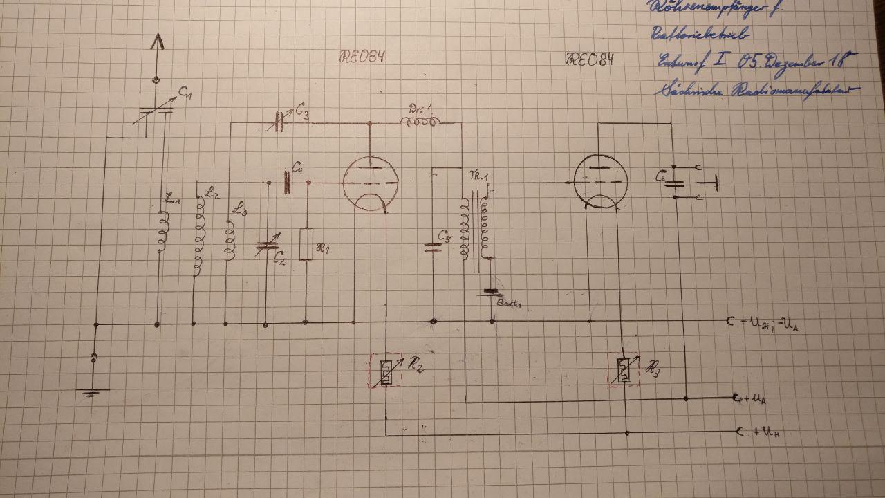 Ich will über den Winter auch mal wieder was basteln - gedacht habe ich hier mal wieder an Uralt-Technik. Mir schwebt ein Einkreiser für Kurzwelle vor, habe auch schon ein paar Skizzen gemacht und mal grob einen Schaltplan "Frei Schnauze" gezeichnet. Bin da recht aus der Übung. Ich kann durch einen edlen Spender wahrscheinlich zwei A408 oder RE084 bekommen, die hier Verwendung finden sollen. Die Krönung wären natürlich Röhren mit Wolfram-Heizung, aber das ist nur Wahnsinn, was die Kosten anbelangt