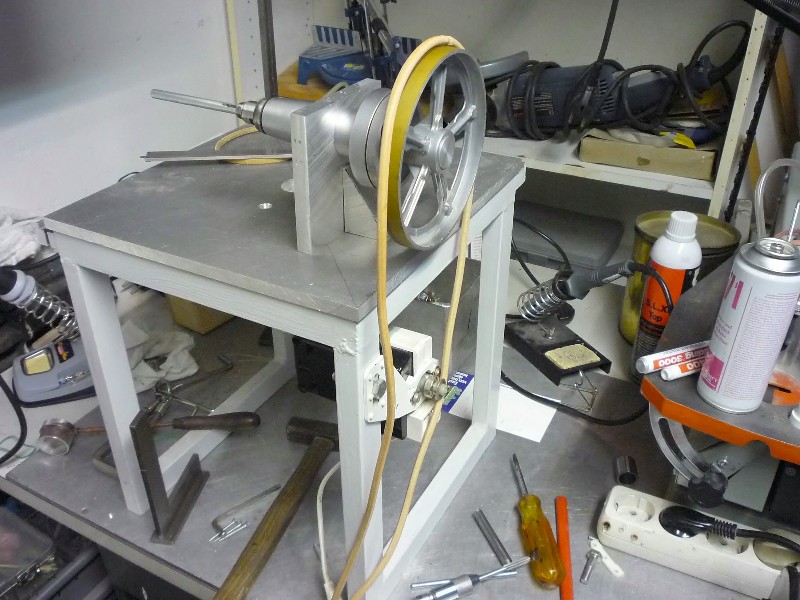 die Wickelvorrichtung ist im Werden. Sie wird von einem Nähmaschinenmotor mit Fussanlasser angetrieben