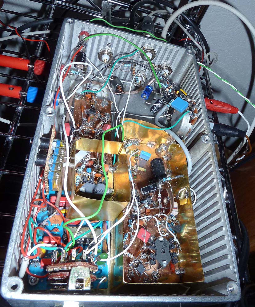 Der Zweck: Einerseits ist die Umsteckerei der Antennen mühsam, daher habe ich die Antennensignale entsprechend auf mehrere Buchsen verteilt. Das UKW-Signal vom Kabel ist derart stark, dass man es einfach mit Widerständen verteilen kann, ein Signalverlust von 30dB ist kein Problem. Das LMK-Signal von der Aussenantenne wird mit einem Breitbandverstärker vor der Verteilung verstärkt. Auf die Antennenanschlüssse für die 'Nur-AM'-Empfänger lässt sich alternativ auch das Ausgangssignal vom KW-nach MW-Konverter schalten, um mit den KW-freien Geräten das 31m-Band zu empfangen und so auch tagsüber 'echten' Empfang vieler Sender zu haben. Weiter kann auch das Modulator-Signal auf die Antennen-Ausgänge geschaltet werden, um den HF-Telefonrundspruch oder Ortssenderempfang zu simulieren. Moduliert wird wahlweise vom eingebauten UKW-Tuner oder einer externen Audioquelle.