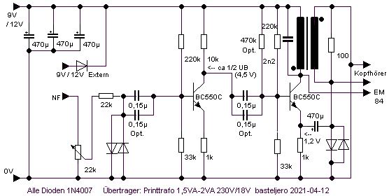 150 Volt braucht man nicht unbedingt, 80 Volt reichen auch noch aus. Es wurden typische "Bastelröhren" verwendet, darüber ein eigener Thread an dieser Stelle: https://www.wumpus-gollum-forum.de/forum...=298&page=4 - "Scotty, wir brauchen mehr Power", geht aber auch mit größerem Kernschnitt: Als Triode geschaltet, gibt die Endpentode auch mehr Schub im unteren Bereich. - Für Batterieröhren ist die Primärinduktivität des 230V-Printtrafos etwas gering, bessere Tiefen ergibt ein für 400V gewickelter Trafo, da er doppelte Windungszahl besitzt: Man kann auch mit Erfolg 2 dieser kleinen 230V-Printtrafos in Serie schalten, - Für das DL651-Hybrid-Audion mit Germanium-Transistoren https://www.wumpus-gollum-forum.de/forum...=461&page=1 wird diese Schaltung als Vorbild dienen: Der Transistor kann weiter aussteuern als die Röhren, 9V Betriebsspannung reichen deshalb.